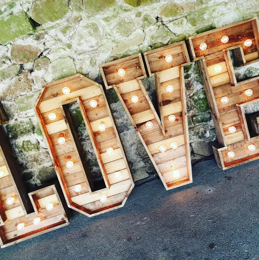 Rustic wood love lights available for hire throughout Devon and Cornwall