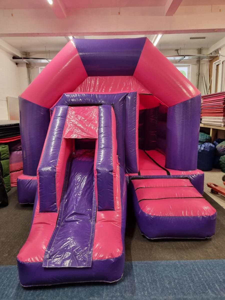 Introducing the 12 x 17 Pink and Purple Front Slide Disco Option for £10 extra , the perfect addition to any party or event! This vibrant and exciting bouncy castle is designed to bring endless fun and entertainment to kids of all ages.