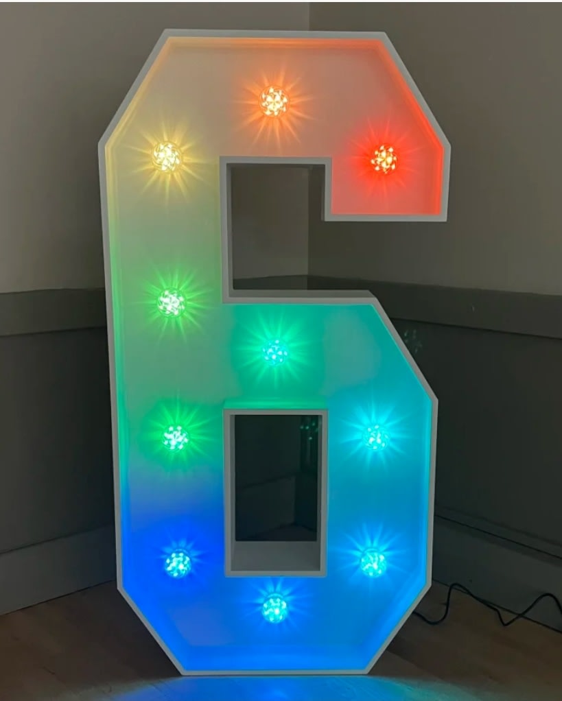 Bright, bold and instantly festive. The Light up number 6 is a 4ft tall, colour-changing display designed for indoor events. It creates a focal point for birthdays, anniversaries, corporate launches and photo backdrops. Quick to hire. Easy to position. Memorable for guests. ππ