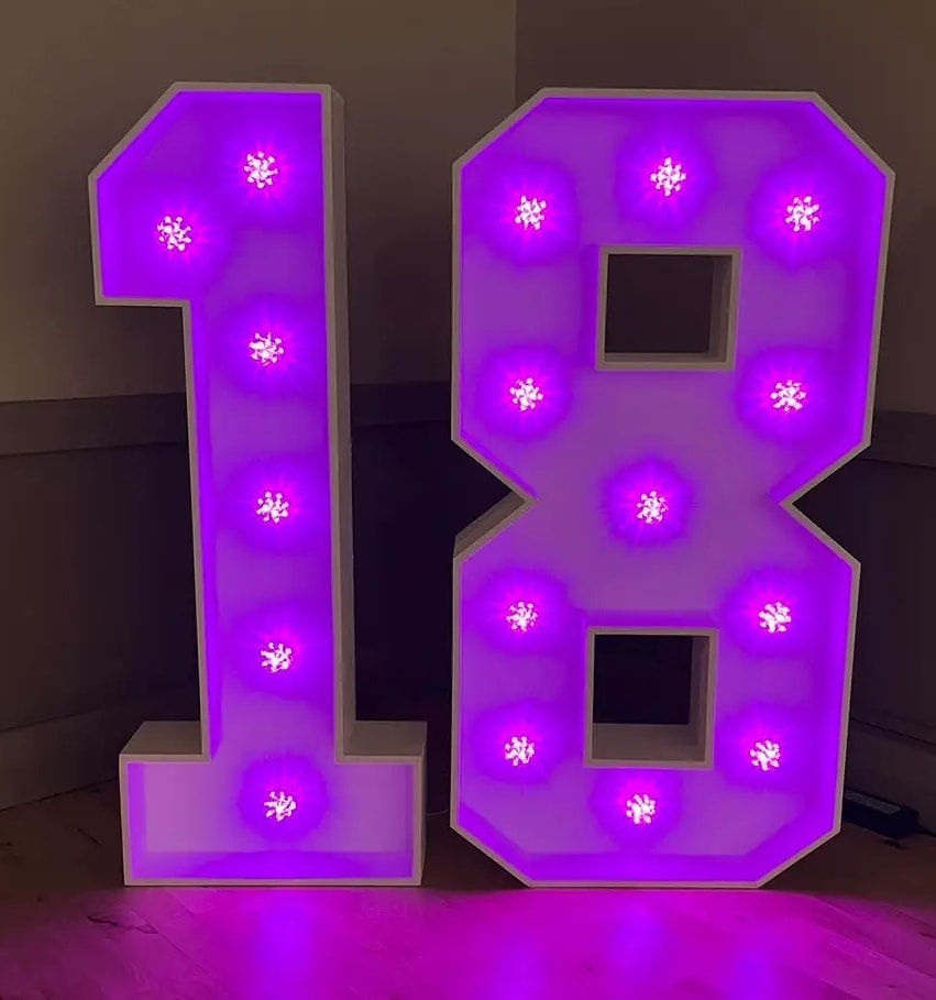 Brighten any celebration with the Light up number 18. This 4ft illuminated figure features colour changing bulbs for dynamic effects and instant impact. Perfect for 18th birthdays, milestone events, photo backdrops and venue dressing. Find the Light up number Light up number 18 in Torquay, Newton Abbot, Paignton, Exeter, Chagford. 🎉