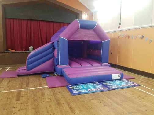 15x17ft child's indoor only purple and blue side slide castle. Along with our other velcro range, this castle can be plain or themed.