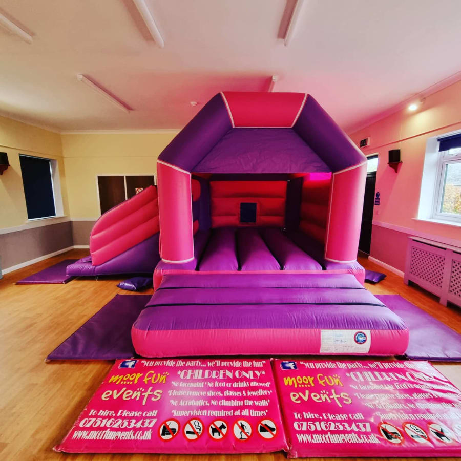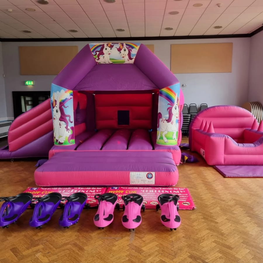 Pink and purple side slide bouncy castle with matching ballpool and 6 didicars or happy hopperz