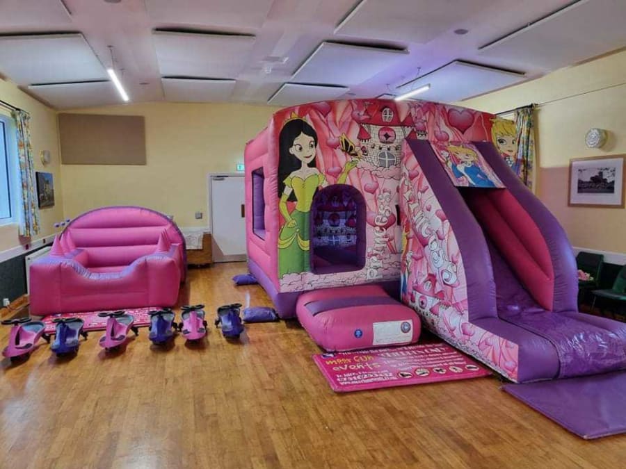 Princess front slide bouncy castle with matching pink and purple ballpool and 6 didi cars or 6 happy hopperz