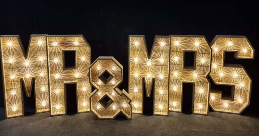 White bouncy castle + Mr & mrs lights (rustic or white)